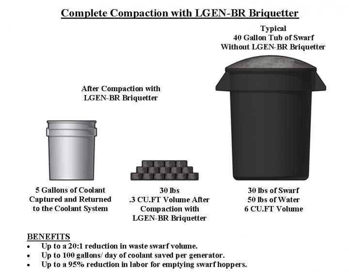 The Filtertech Model LGEN-BR Compactor System provides an effective means for optical lens generating. Compressing and dewatering swarf 20:1 volume reductions are realized while also removing virtually all coolant from the swarf. The result is a very dry, hard puck shaped briquette. The system can be set up to operate on its own by simply feeding the unit with loose swarf, either automatically via a conveyor system or by dumping tubs of swarf into the feed hopper. The system can also be set up in front of a Filtertech Coolant Filtration System. Dirty coolant with swarf can be pumped directly to the LGEN-BR System. The bulky swarf is formed into pucks while the coolant flows through to the filter system for ultra-clean clarification. A single LGEN-BR4-2000 can handle up to 16 generators.
