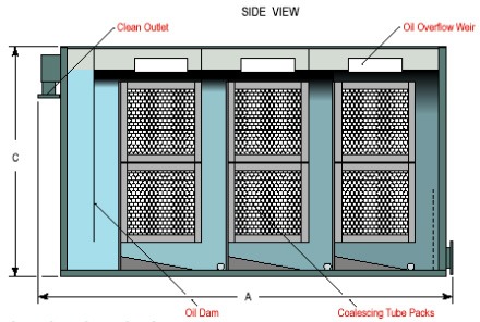 The aqueous solution then passes over the solids dam and flows through the coalescing tube packs which consist of many polypropylene tubes that are closely packed. As the solution travels the tortuous path through the tube packs, the oil droplets only need to rise a short distance to come into contact with the tube above. Since the polypropylene is oleophilic (oil attracting), the oil droplets readily adhere to the tube surface.