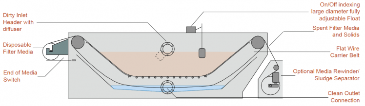 Over time, the filter “cake” becomes thicker causing the level in the liquid pool to rise. This is sensed by a level control float which then automatically indexes a small amount of the dirty media out of the filter at the same time introducing fresh media.